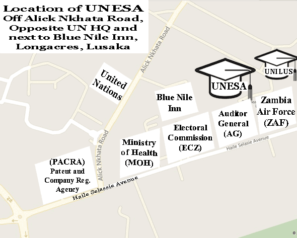 Location of UNESA’s Main Campus UNESA is easy to find in Lusaka's Longacres area because it is located in an area with major buildings of the Government and other institutions. It lies opposite the United Nations headquarters in Zambia. It is on an unnamed close, off Alick Nkhata Road, where Blue Nile Inn is also located. Please see the map below. For any further inquiries please feel free to contact us at UNESA.